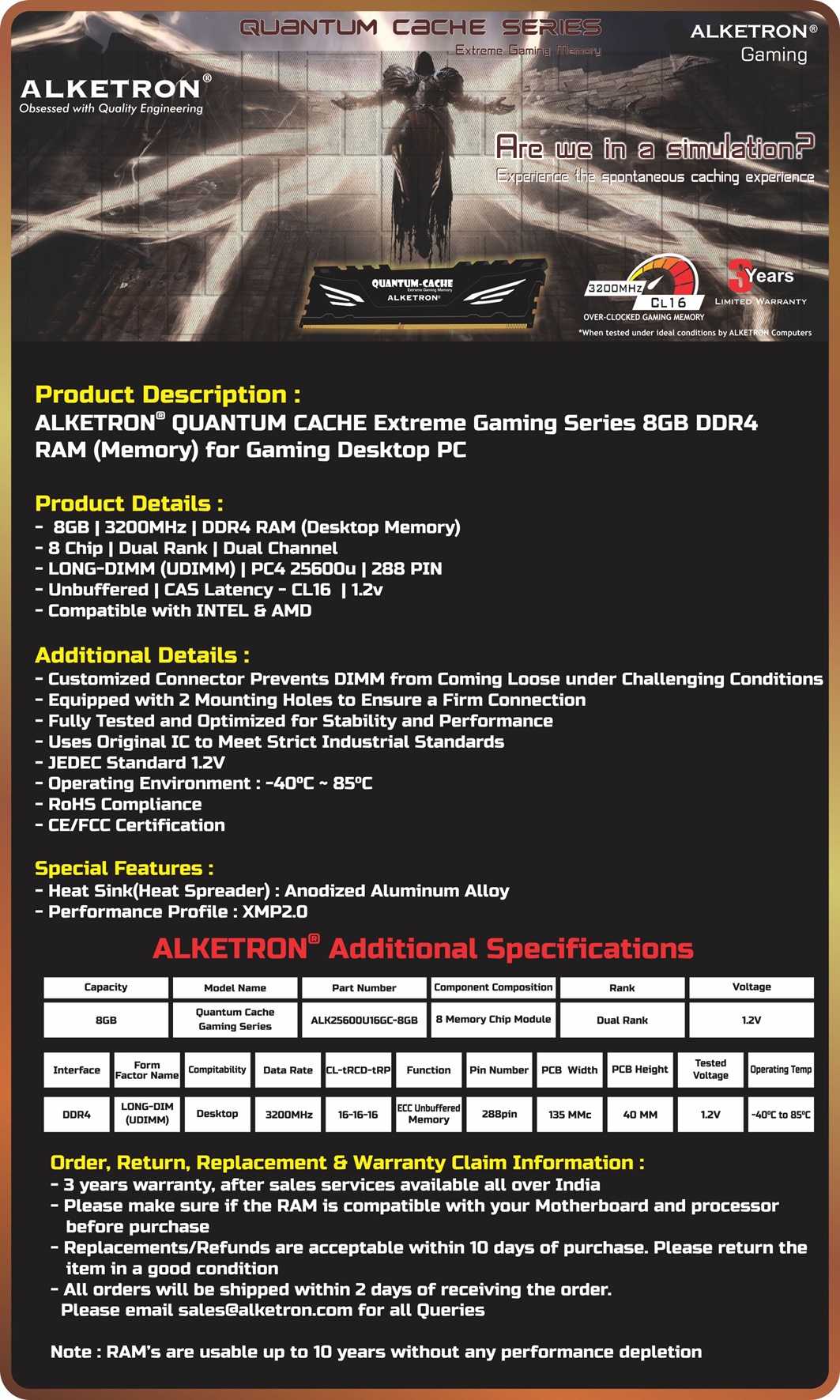 8GB DDR4 RAM Desktop (KIT) - ALKETRON Quantum Cache Gaming Series
