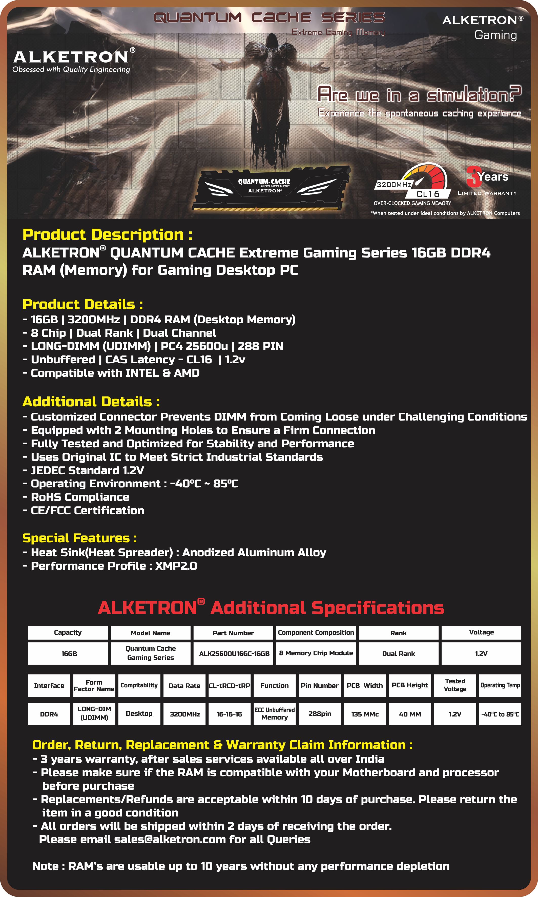 16GB DDR4 RAM Desktop - ALKETRON Quantum Cache Gaming Series